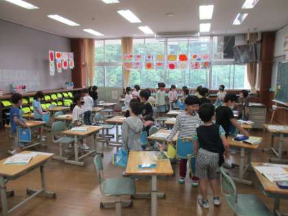受け取った名刺は各自教科書にはさんで持ち帰っていますので、誰からもらったのか、どのように渡したのか、など、聞いてあげてください。(余った自分の名刺を持ち帰った子供たちもいます。お家の方に実際にお渡しして、どのように渡したのかがつたわるようにしよう、と伝えてありますので、ぜひご協力ください。)
