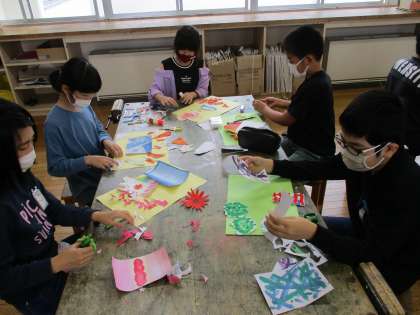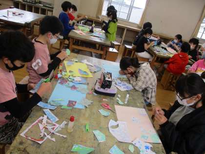 図画工作科では、「心のもよう」を色の混ぜ方や重ね方で表す学習を進めてきました。「心のもようカード」を「心の台紙」に貼る活動では、「ただカードを貼るだけじゃおもしろくない」と、自分の気持ちに合った形を考えてカードを切ったり、貼り方を工夫したりする姿がありました。