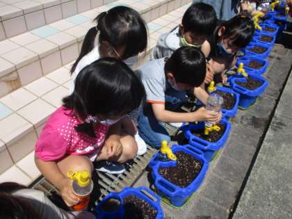 朝は芽が出ていなかったのに「芽が出ているう!」という声が続出しました。水をかけて観察していると、「葉っぱが前より出てきたよ!」「起き上がってきた気がする!」とうれしそうに話す子供たちが出てきました。今、土の下でがんばっている芽にも、早く会いたいですね。