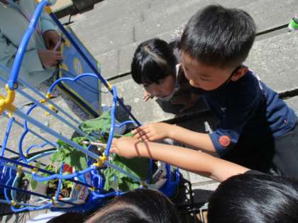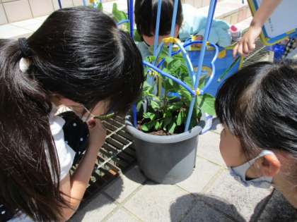 今日は国語の学習で、書きたいことを中心に、生活科で育てている野菜の苗を丁寧に観察してみました。じっくりと観察してみると、いろいろな発見がありました。花が咲くのを心待ちにしていた枝豆ときゅうりを育てている子供たちは、小さな実やつぼみがついているのを見つけて大喜びしていました。子供たちが集まってきて、お母さんのような温かいまなざしできゅうりの赤ちゃんや枝豆の赤ちゃんを嬉しそうに見ていました。