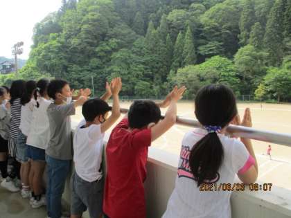 3年生の子供たちは、ベランダから、声は出さず、拍手で応援しました。「すごくがんばっているね」「ぼくも来年走りたい」と思いをはせているようでした。