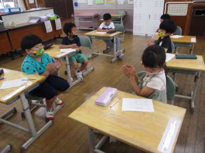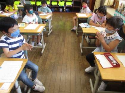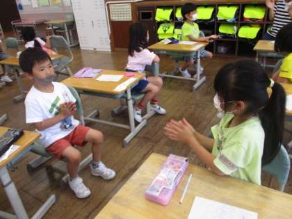 今日の音楽科では、3文字の言葉や5文字の言葉をつなげる活動を行いました。手拍子にのせて言葉を言うのは難しかったですが、練習するうちに速いテンポでも隣の友達とつなげるペアが増えました!