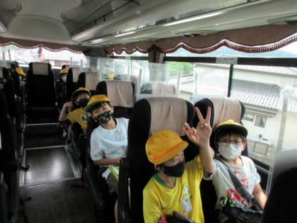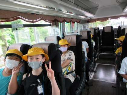 快晴の中、元気に出発しました。コロナ対策として、バスに乗る前に消毒をすること、静かに座ること、また、熱中症対策として、こまめに水分をとること、また最後まで水筒のお茶が残るよう考えて飲むこと等、健康面に気を付けるよう心がけました。