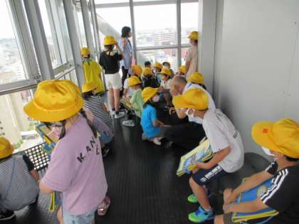 次の見学地は、富山市展望塔でした。高いビルがたくさんありました。富山城や富山県庁、テレビ局や新聞社等も見えました。富山駅も見え、新幹線や市内電車も走っていました。