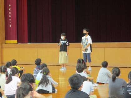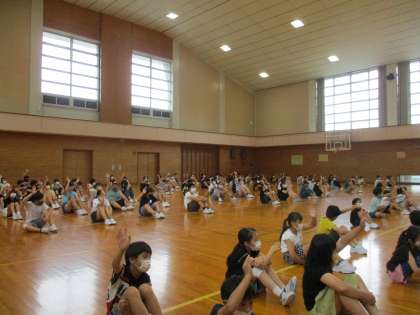 プール開きの式があり、運動委員会の代表が今年の目当てを発表しました。あいにくの天候で入水はできませんでしたが、どの子も目当てもって2年ぶりの水泳学習に取り組んでほしいと思います。