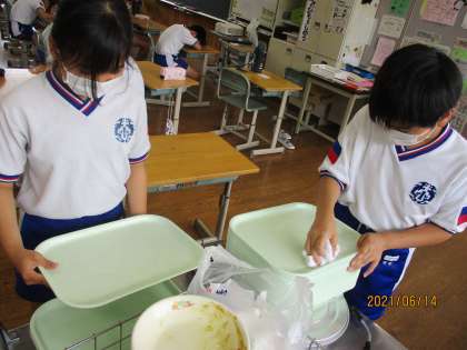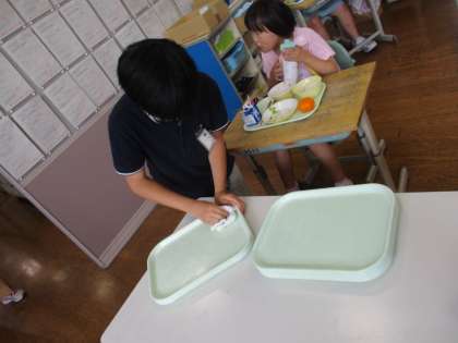 給食後には、黙々と働く姿があります。おぼんの汚れやごみを確かめることで、調理員さんに感謝の気持ちを届けようとしているようです。自ら考え、進んで取り組む姿が立派です。