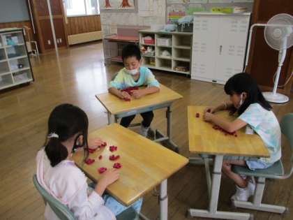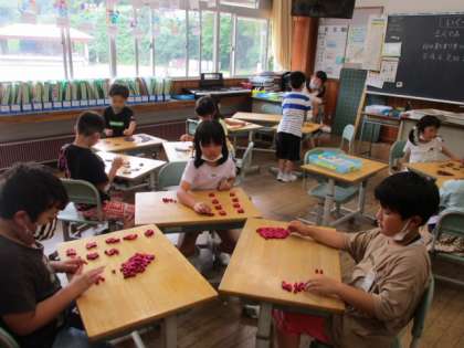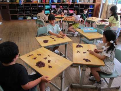 算数で、つかみどりゲームをしました。3人一組になって、豆や小さいブロックを両手でつかみます。つかむゲームをしながら、3人の合計数を数えます。10のまとまりをつくる、10が10こできたら、100にするなど1年生で学んだことを生かしながら上手に数えることができました。これからも100より大きい数を楽しみながら、学習していきたいと思います。
