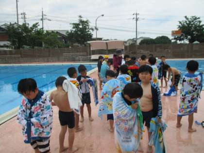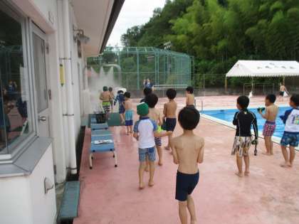 今日はシャワーの使い方やプールサイドでの注意、プールへの入水の仕方が中心の学習となりましたが、最初は不安そうだった子供も、友達の様子に次第に心が和らぎ、全員が活動に取り組むことができました。