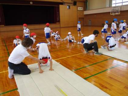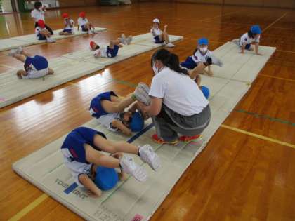 最後は、ゆりかごのように丸くなって体を揺らしたり、前転に挑戦したりしました。あっという間の貴重な1時間でした。子供たちから、「楽しかった!もっとやりたかったな!」という声が聞こえてきました。