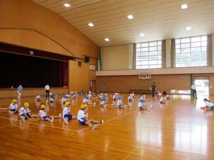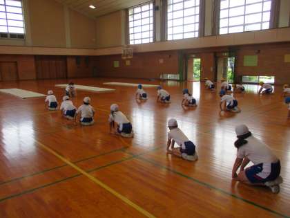 4名の指導員の方をお招きして、マット運動を教えてもらいました。準備運動の時間には、「ここは足の裏を床につけるよ」「マットをする前にこの動きをしておくといいよ」等と指導してもらい、とても勉強になりました。