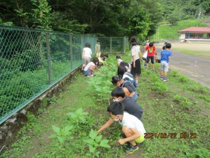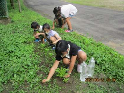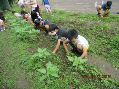 5月6日に種を植えた「ホウセンカ」「ヒマワリ」「ピーマン」「オクラ」が大きく育ってきました。周りの雑草もたくさん出てきたので、今朝は草むしりをしました。みんな手を泥まみれにしてがんばっていました。