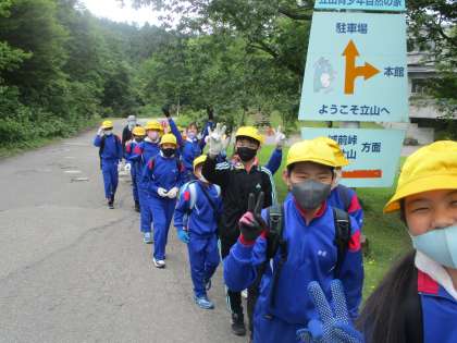 出発式、入所式を終え、来拝山を目指しました。登り始めは、みんな余裕の表情でした。