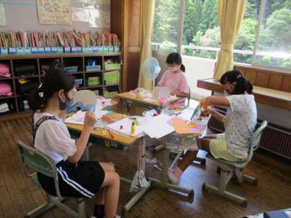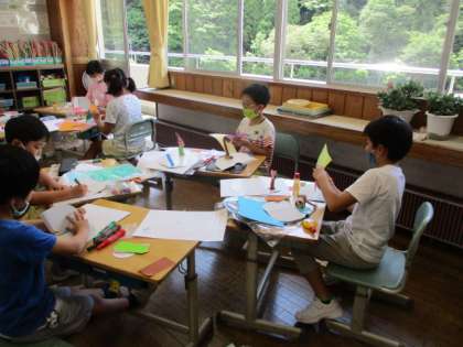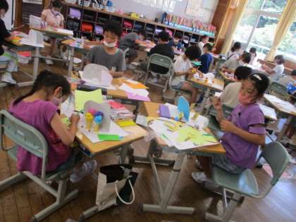 今日は、割ピンをつかって紙を回す台を利用して「くるくるランド」を製作しました。立体作品になるよういろいろ工夫していました。