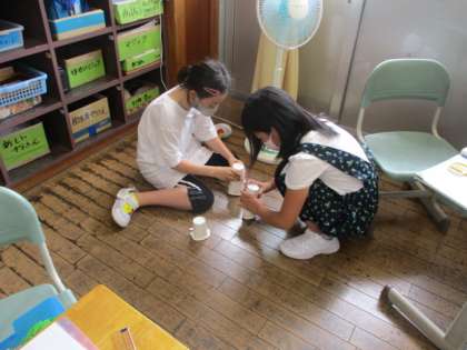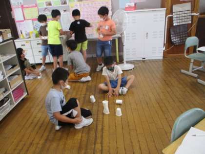 今日は、「ぴょんうさぎ」を作って、「どうやったら高く跳ばせることができるか」を考えました。「ゴムをたくさん使ったらよいのでは?」「ゴムをクロスさせたら、しっかりゴミが伸びて高く跳ぶのでは?」「ぐっと上のカップを押すとゴムが伸びて、高く跳ぶのでは?」といろいろ考えて、試行錯誤しながら取り組んでいました。