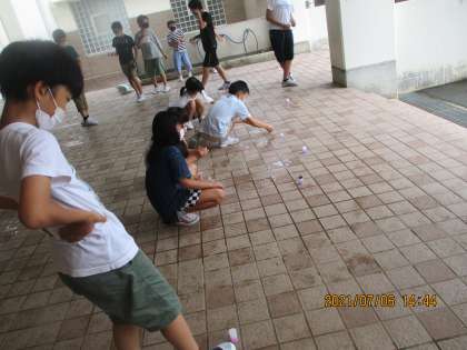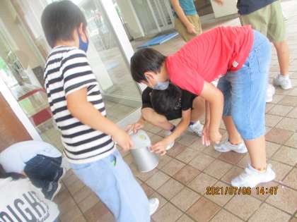 今日の実験は「バブル爆弾」です。今では、なかなか手に入らないフィルムケースに、入浴剤を入れてふたを飛ばす実験です。最初の説明で、「爆弾」と聞いてドキドキしていた子供たちでしたが、実際にやってみると「ポン」と音を立ててふたが飛ぶ様子に大喜びでした。実験がうまくいかなかった仲間にフィルムケースを交換してあげたり、コツを教えてあげたりする姿が見られ、今学期のクラブを楽しく締めくくることができました。