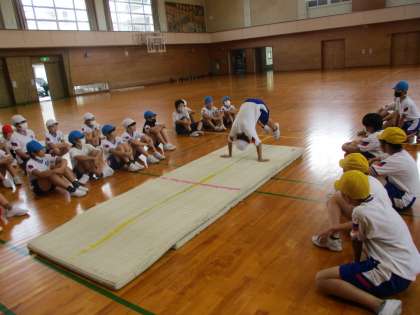 体育科のマット運動では、難しい技に挑戦する子が増えてきました。大切なポイントをしっかりと聞き、練習を重ねることで、上達しています。
