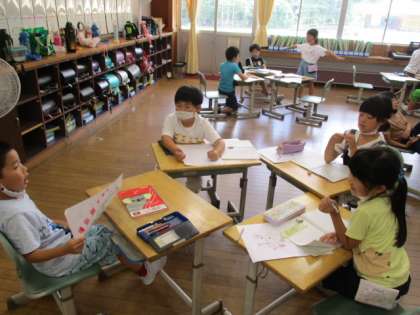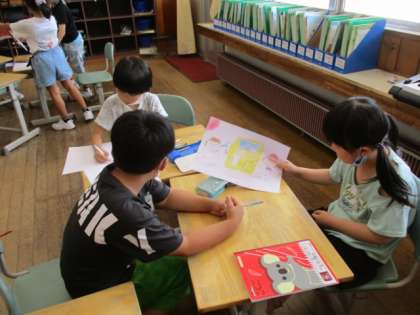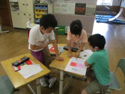 国語では、あったらいいなと思うものを絵に表し、友達に発表する学習をしています。今日は、自分が考えたものについて話し、友達からいろいろ質問してもらいながら、くわしく考えました。友達と楽しくやりとりしながら、「あったらいいなこんなもの」がさらにレベルアップしていきました。