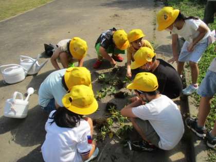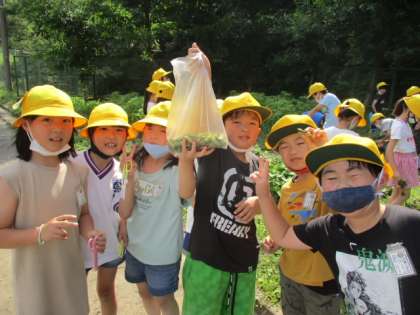 今日は畑で育てていた、畑の枝豆を収穫しました。子供たちが一人一鉢で育てている枝豆と違い、雑草の中でなんとかたくましく育っていました。みんなではさみで実を切り取り、袋にたくさん?収穫することができました。