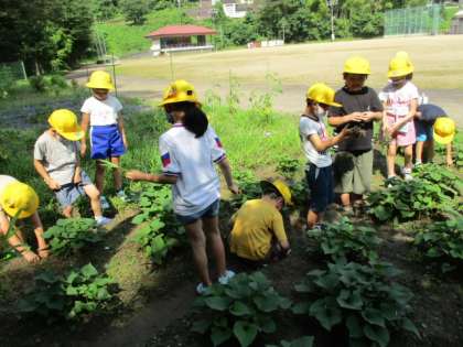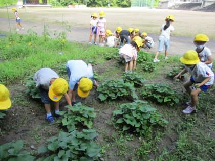 枝豆の収穫とともに、さつまいもの畝の草むしりをしました。草むしりをした分だけ、サツマイモが大きく育ってくれます。これから先、大きく葉が茂って、大きなサツマイモが収穫できるのが、楽しみですね。