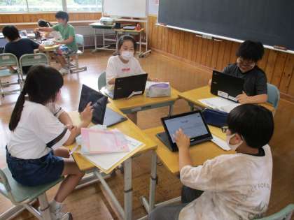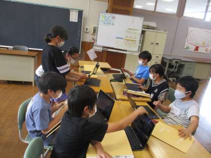 総合的な学習の時間に、チーム毎で活動を進めてきました。土日を前に、消防団をしている家族にインタビューしようと計画したり、仲間にクロムブックでアンケートに答えてもらおうと準備したりしました。
