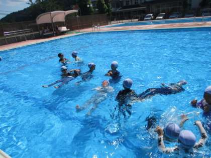 今日の着衣泳では、服を着た状態では泳ぎにくいことを体感すること、万が一の時に救助を待つ間、上を向いて浮いている練習をしました。