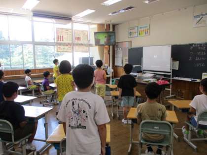 本日は暑さ対策のため、教室でリモートで終業式を行いました。校長先生のお話の後、皆勤賞を頂きました。代表の人に合わせて起立して表彰していただきました。