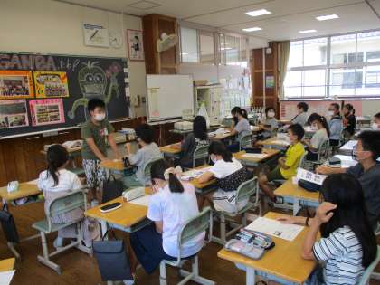 終業式の日にさかのぼりますが、Mさんが「火防線について調べたけど、自分の町内にはないみたい。みんなの地域や夏休みに出かけたところで見つけたら教えてほしい」というお願いのチラシを配りました。その紙を持ってきて、今日参加できなかったMさんの代わりに質問する仲間もいました。聞いたことをMさんに伝えるのが楽しみですね。