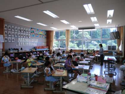 授業時間。今日も暑いので、エアコンで温度調節をしながら、常時換気も行っています。子供たちは、しっかりマスクを着用。集中して学習しています。