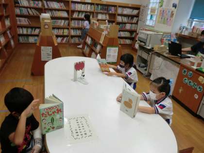 休み時間。洗面所が混んでいたら、離れて待っています。図書室では、ルールを守って密を避けています。