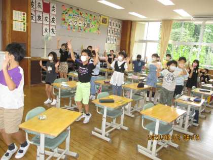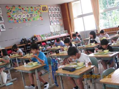 2学期がスタートし、子供たちの大好きな給食も始まりました。給食時には、話をしない、距離をとって学習するといったことをみんなで気をつけています。写真は、給食と朝の運動のものです。体力をつけようと毎朝、子供たちは自分たちで運動メニューを決めて取り組んでいます。これからも、体力と栄養をつけて健康な体を作りましょう。
