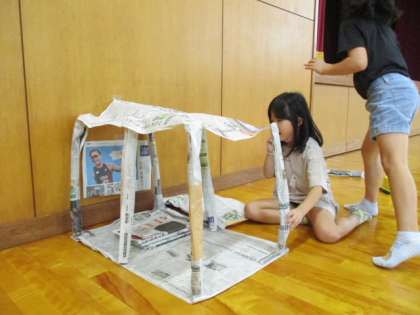 友達と協力しながら、夢中になってつくっていると、あちこちでいろいろな作品ができてきました。弓矢、剣、おうち、恐竜などダイナミックな作品が多いです。新聞紙を身につけて楽しむ姿も見られました。