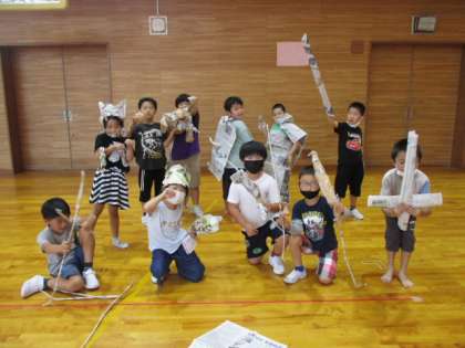 2時間はあっという間でした。できた作品を写真に撮って、最後はみんなでお片付け。とっておきたい作品は壊さずに残しておく子もいました。「またやりたいな」という声も聞こえてきて、子供たちにとって楽しい時間となりました。(記念撮影に合わせて、一部、マスクを外しています。)
