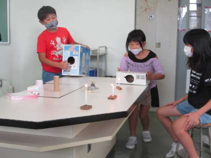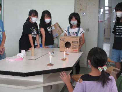 紙コップやろうそくを置いて実験してみました。ろうそくの火を3つ消せた友達を見て、負けじとどうやったら消せるのかを考え何度も挑戦している姿も見られました。