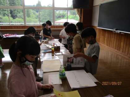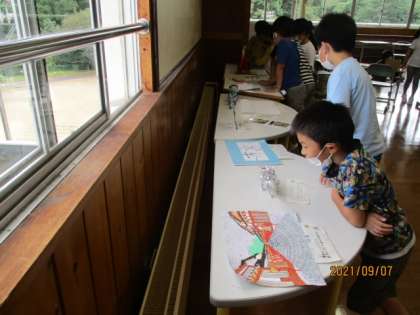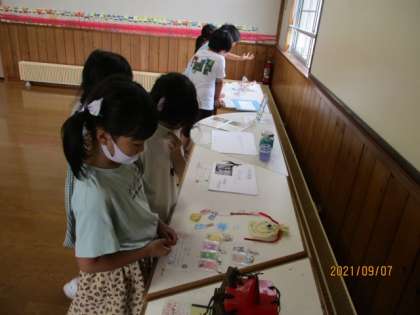 今日は、夏休みの作品展で、他の学年の作品を見に行きました。高学年のつくった作品はとても手が込んでいて、足を止めてじっと見る姿が見られました。「ねえねえ、この作品すごいよ。」と声をかけながら、面白さやよさを友達に伝えていました。