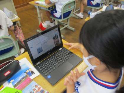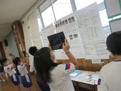 夏休みの作品展の見学でも、クロムブックを活用しています。来年は最高学年。小学校生活最後にどんな作品にしようか、テーマを考えて始めているようでした。