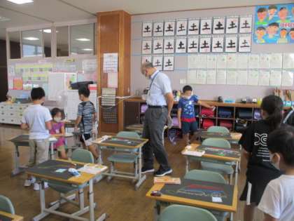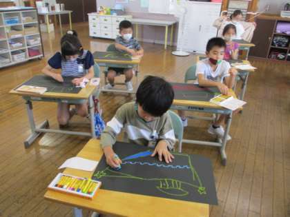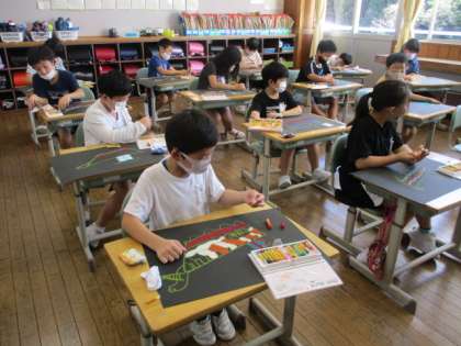 今日は、不思議な海を渡るすてきな船を、黒い紙にクレヨンで描きました。力強く描くことではっきりとしたすてきな船が出来上がりました。休み時間に通りかかった校長先生にも「すてきだね」と褒めて頂いて、みんな、もっともっと自信がもて、楽しんで描いていました。