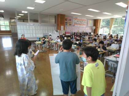 4年生 地球温暖化対策新聞を5年生に届けました