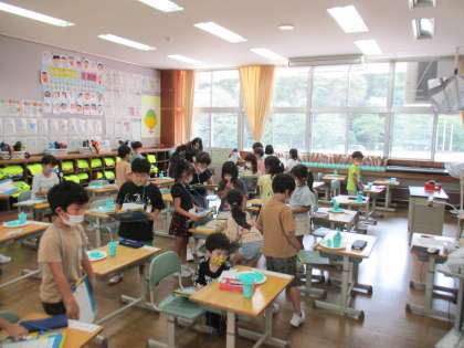 それぞれの作品を机の上に並べて、いろいろな友達の作品を見て回ることができました。