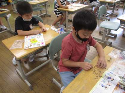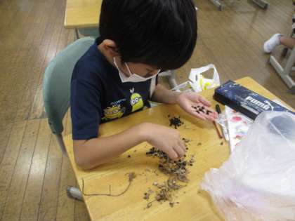 算数で学んだ大きい数の数え方を生かして、10のまとまりを作りながら数を工夫して数える姿が見られました。取った種をどのように使いたいか、子供たちと話し合って決める予定です。