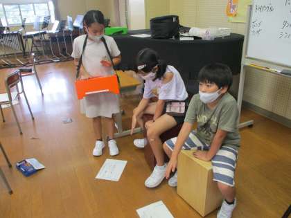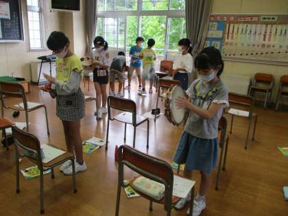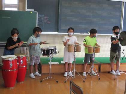 4年生の音楽の学習は、打楽器を使っての音楽作りをしています。新しく購入していただいた「カホン」という楽器やウッドブロック、ボンゴ等を使いながら、楽しい曲を作っていました。来週は、グループで曲を作ります。どんな曲ができるのか楽しみです。