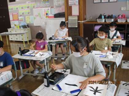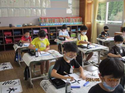今日の書写は、先週から引き続き右払いの練習を行いました。腕を浮かす感じで筆を後かすのが難しいようでした。みんな、真剣に取り組んでいました。