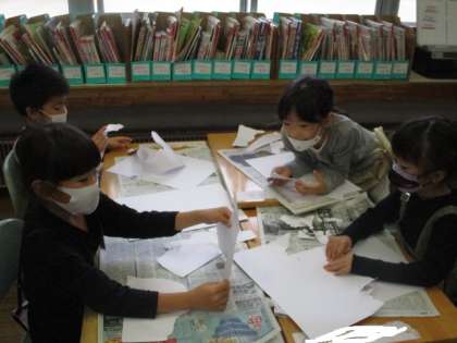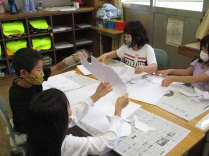 図工科では、紙を破いて何に見えるか考えながら、自分だけの世界を作っていく活動を行いました。魚に見えるパーツから海の中にいるものを作ったり、野菜に見えるパーツから野菜の仲間を作ったりしていました。ロボットと消防車、というおもしろいお話ができそうな子もいました。