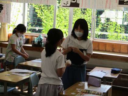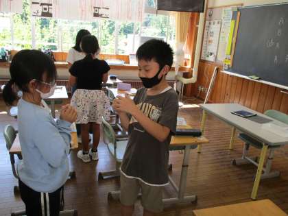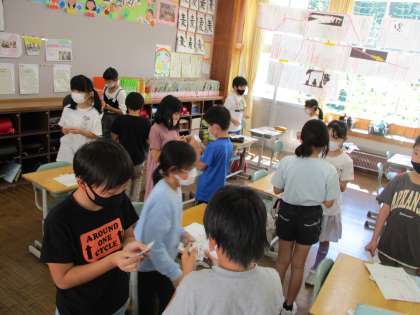 今日は、外国語で学習している文房具のカードを使って、コミュニケーションゲームをしました。先週よりも積極的に話している様子がとても微笑ましく、みんなで楽しく活動しました。