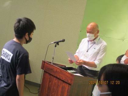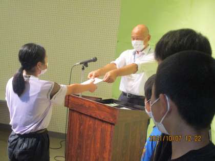 給食の時間に、チャレンジ陸上記録会の授賞式を行いました。「50m走、ソフトボール、走り幅跳び」の3種目で金スターだった6年生12名が、校長先生から記録証を受け取りました。
