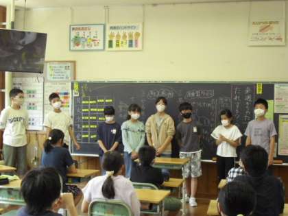 今週は、運営委員会の企画の「挨拶たすきリレー」に5年生が参加する週でした。これまで運営委員会と共に挨拶運動に毎日取り組んできた「KING−GANBAーズ会社」と運営委員会の仲間が、参加するメンバーを決めようと5松会議を開いてくれました。