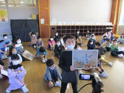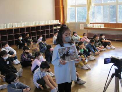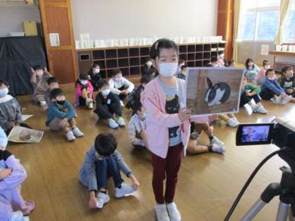8時45分、約束の時間に三郷小学校の子供たちが画面に映ってつながると、子供たちから歓声があがりました。緊張しながらも、八尾小学校の子供たちがうさぎや学校の紹介をしました。