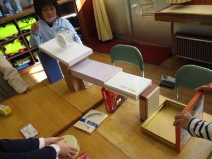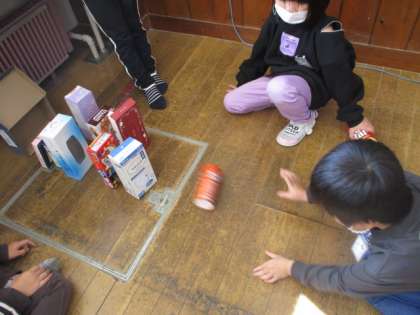 タワーの他には、ボーリングやすべり台などで転がる空き箱を使っているグループもありました。倒れにくい箱、倒れやすい箱を用途に合わせて選んでいました。