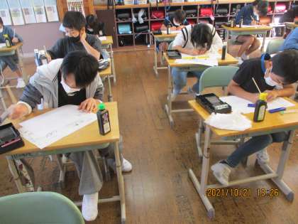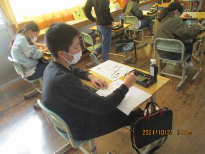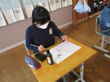 国語科で「鳥獣戯画を読む」を学習しています。図画工作科でも、その鳥獣戯画を取り上げ、体験や鑑賞の時間をもちました。なぞり書きに夢中になっている様子で、時間も忘れるくらい真剣に描いていました。