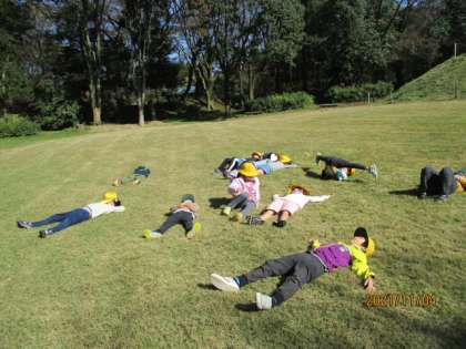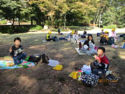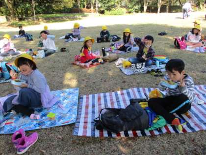 子供が朝から楽しみにしていた昼食の時間です。距離をとり、私語を控えながら食べました。美味しいお弁当を食べた後、日向ぼっこをする子供たちの様子です。
