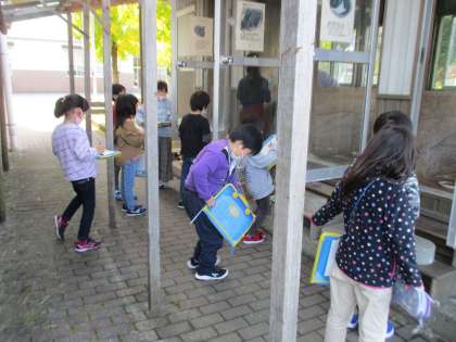 写真は、特徴をとらえようと、ウサギの絵を描いている様子です。